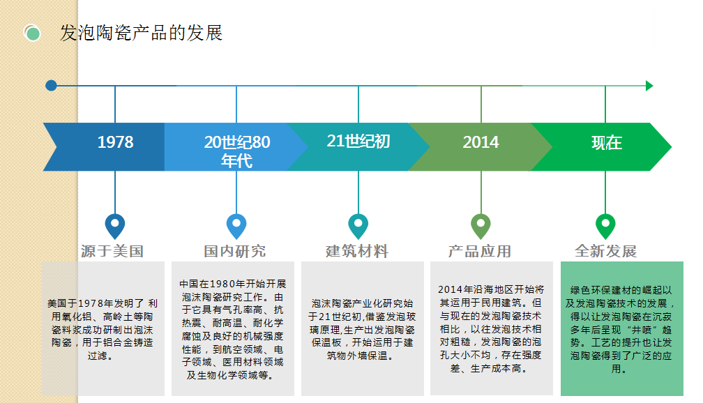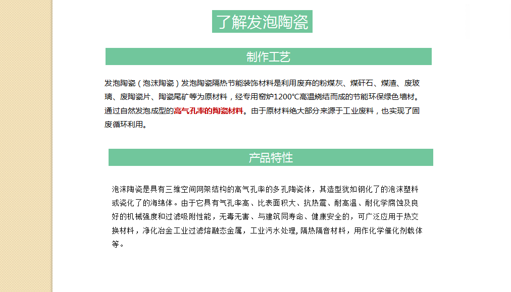 8.發(fā)泡陶瓷介紹:發(fā)泡陶瓷(泡沫陶瓷)發(fā)泡陶瓷隔熱節(jié)能裝飾材料是利用廢棄的粉煤灰、煤矸石、煤渣、廢玻璃、廢陶瓷片、陶瓷尾礦等為原材料,經(jīng)專用窯爐1200℃高溫?zé)Y(jié)而成的節(jié)能環(huán)保綠色墻材。通過自然發(fā)泡成型的高氣孔率的陶瓷材料。由于原材料絕大部分來源于工業(yè)廢料,也實(shí)現(xiàn)了固廢循環(huán)利用。