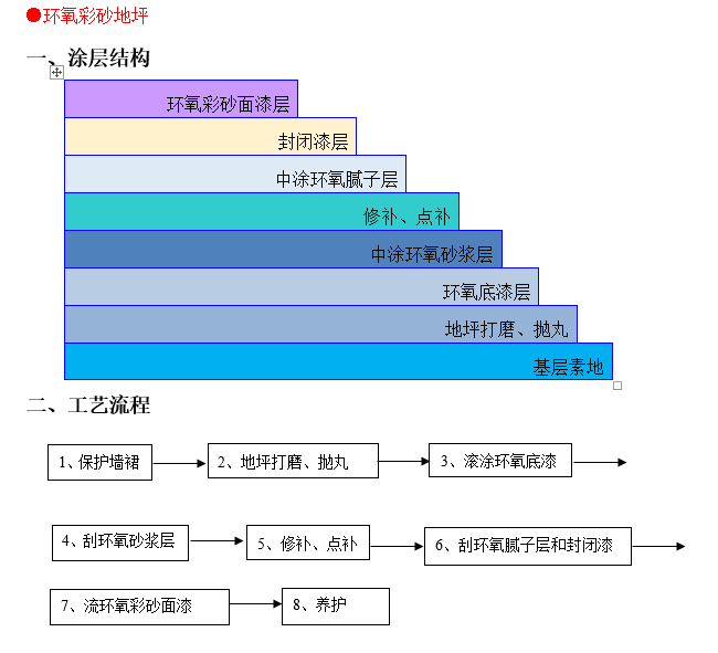 1.材料組成:環(huán)氧彩砂地坪主要由環(huán)氧樹(shù)脂、顏料、石英砂或石英粉等組成。顏料用于賦予地坪涂層所需的顏色,而石英砂或石英粉則賦予地坪獨(dú)特的砂粒紋理。